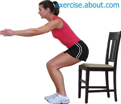ให้ ยืนแยกเท้าห่างประมาณความกว้างสะโพกหรือไหล่ ย่อเข่าลงยืนดังภาพ > นั่งลงบนเก้าอี้ > กลับสู่ท่าตั้งต้น > ยืน > กลับสู่ท่าตั้งต้น > นั่ง สลับกันแบบนี้ 10 รอบ, ถ้าต้องการแข็งแรงมาก ให้หาตุ้มน้ำหนักมาช่วย > [ 7 วิธีทำให้ฟิต(เล่นเวท)แบบสบายๆ ]